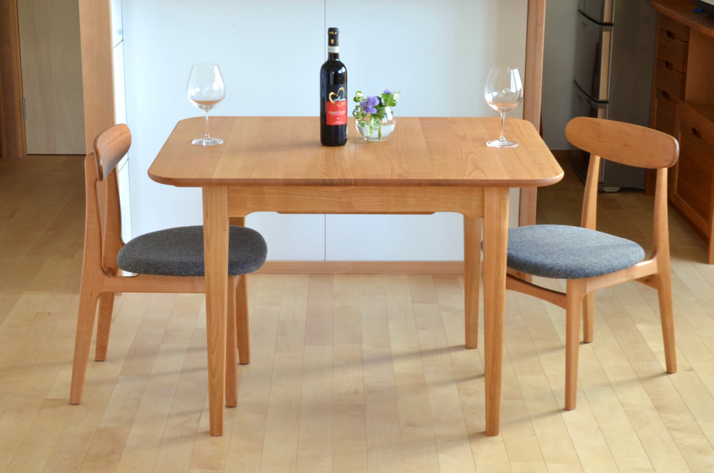 新しい定番商品ができました。うちの主力商品となりつつあるエクステンション・テーブルですが直径1100ではマンションにお住まいの方や夫婦二人暮しの方などから少し大きすぎるとの声がありました。そこでそのような方に向けて新たにコンパクトサイズのエクステンション・テーブルを設計することにしました。縮めた状態では間口1050㎜奥行き800㎜で普段は二人でゆったり使えるサイズです。そこから450㎜伸ばし、1500㎜の天板になります。4人でゆったり、がんばれば6人で使えるサイズです。普段はなるべくコンパクトに使ってもらえるように奥行きが800㎜にした為、どうしても400㎜伸ばすだけではあまり天板の面積が広くならないような気がして工夫して450ミリ伸ばすように設計し直しました。丸テーブルのときとあまり形は変わってないように見えますが実はいろいろと見えないところが変わっていたりします。また一つのノウハウが増えました。いろんな方に使ってもらえると嬉しいですね。