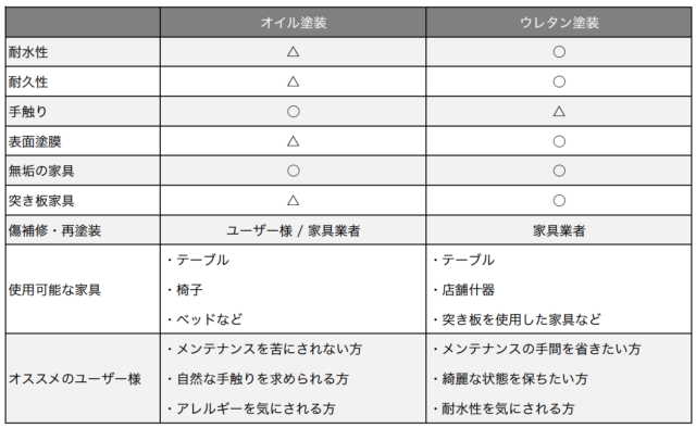 A.オイル塗装の場合、ウレタン塗装に比べ、定期的にメンテナンスが必要で手間がかかります。しかし、その煩わしさを超える魅力があるからオススメできるのです。